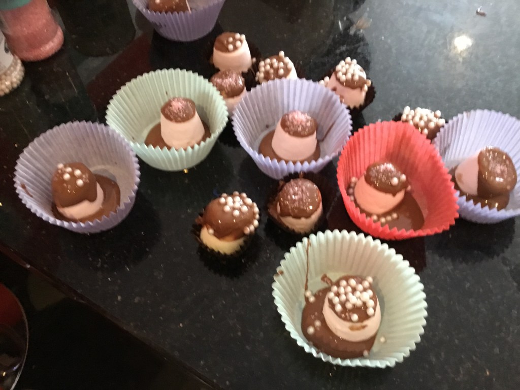 - Add a smartie (or similar) to the melted chocolate on top of the marshmallow.