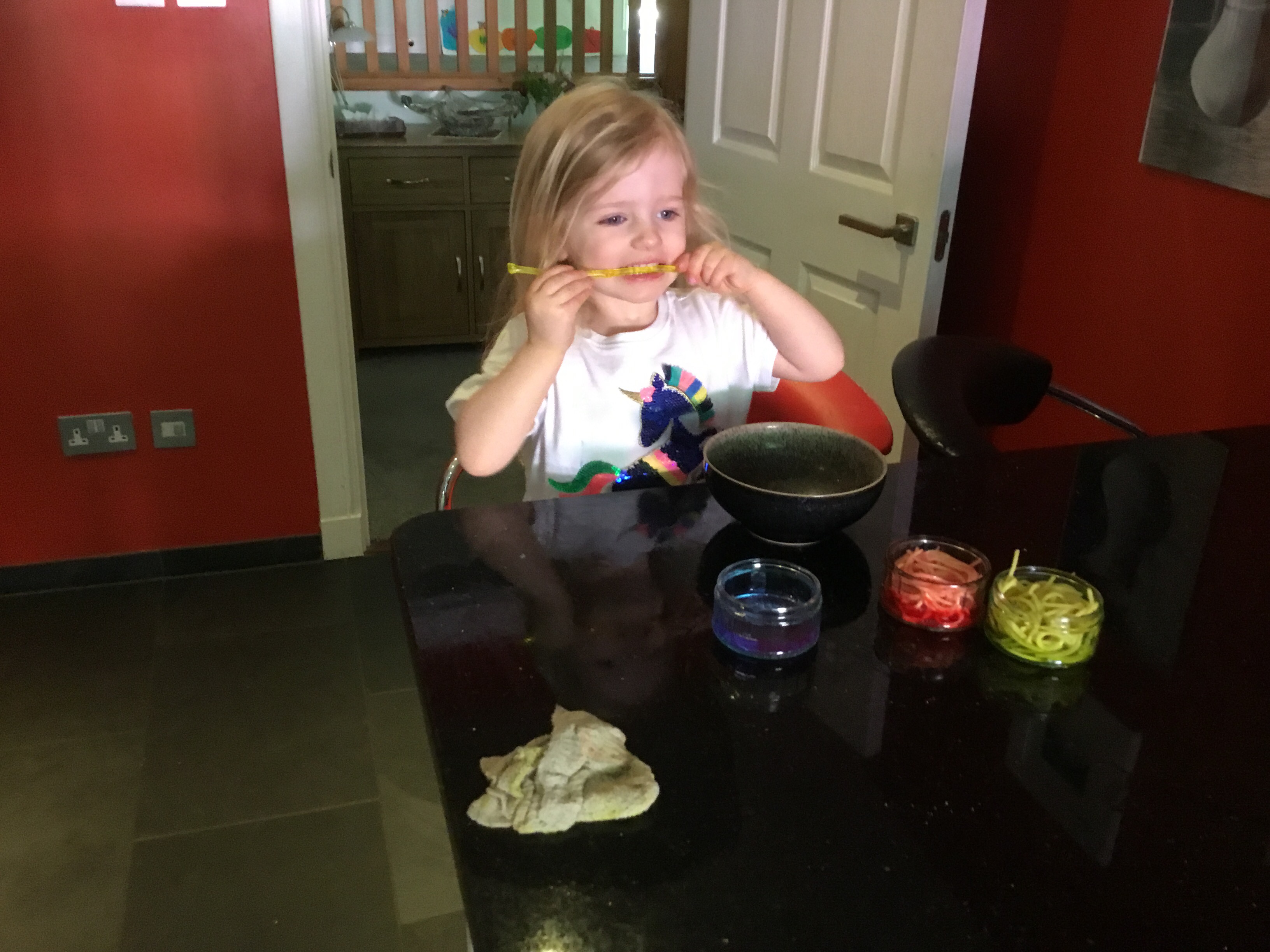 β We started using sandwich bags to mix the spaghetti and colouring but I found that unnecessary waste so using bowls and a mixer was much easier.