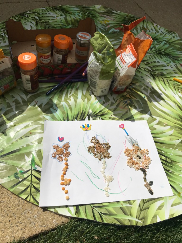 – we just used what we had in our cupboard and was out of date but you could experiment with different colours or even dye the seeds using food colouring