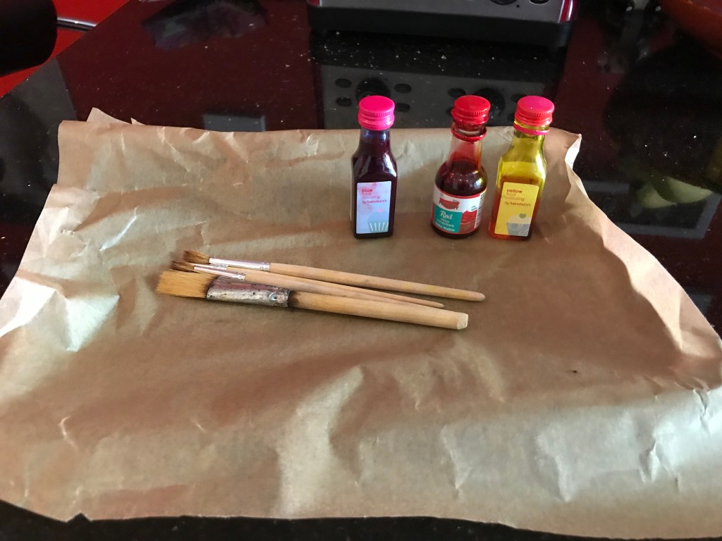 - Add a few drops of food colouring to each bowl and mix well. More food colouring will give brighter colours.