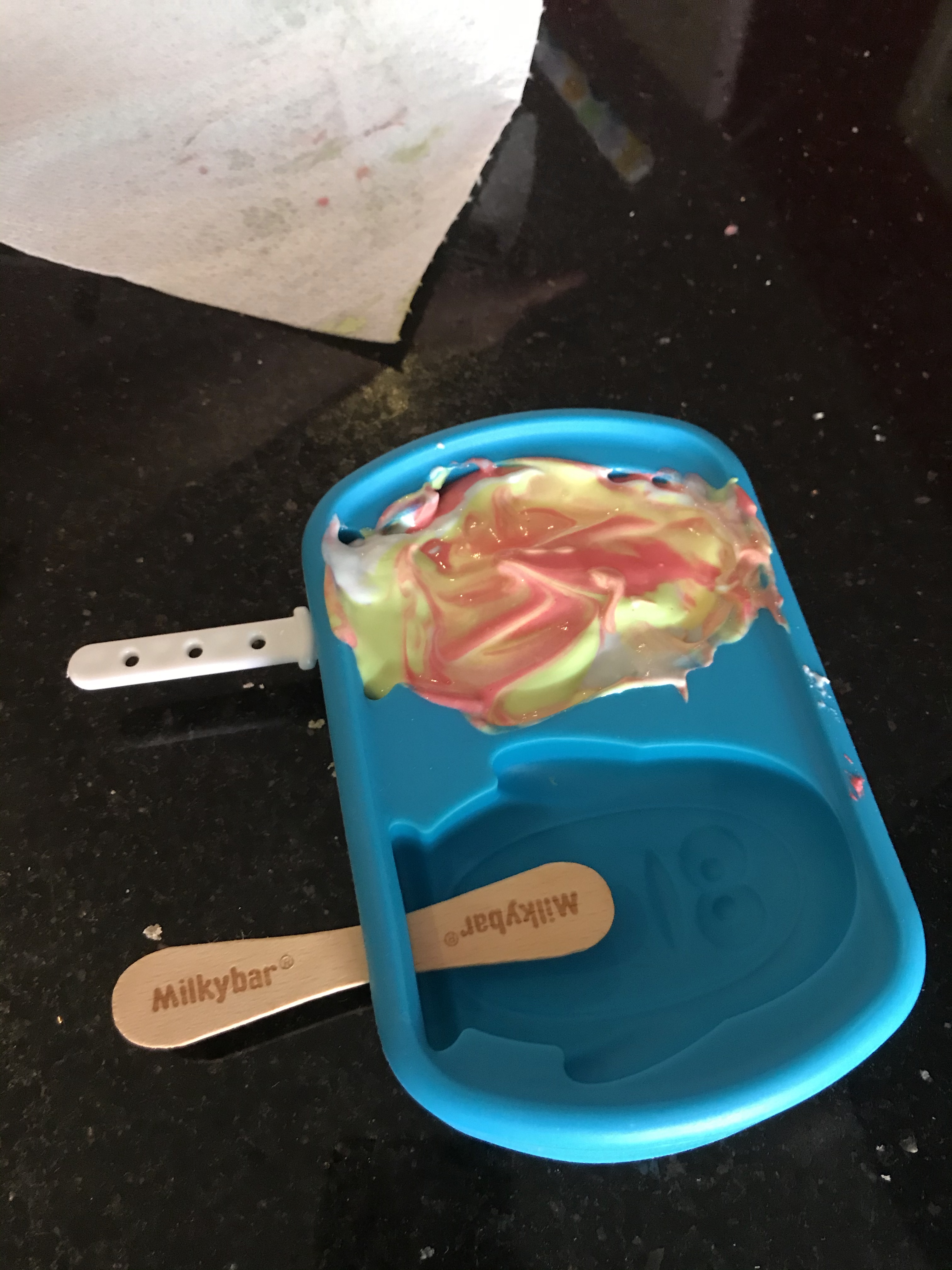 Freezing the leftovers to make rainbow yoghurt ice lollies