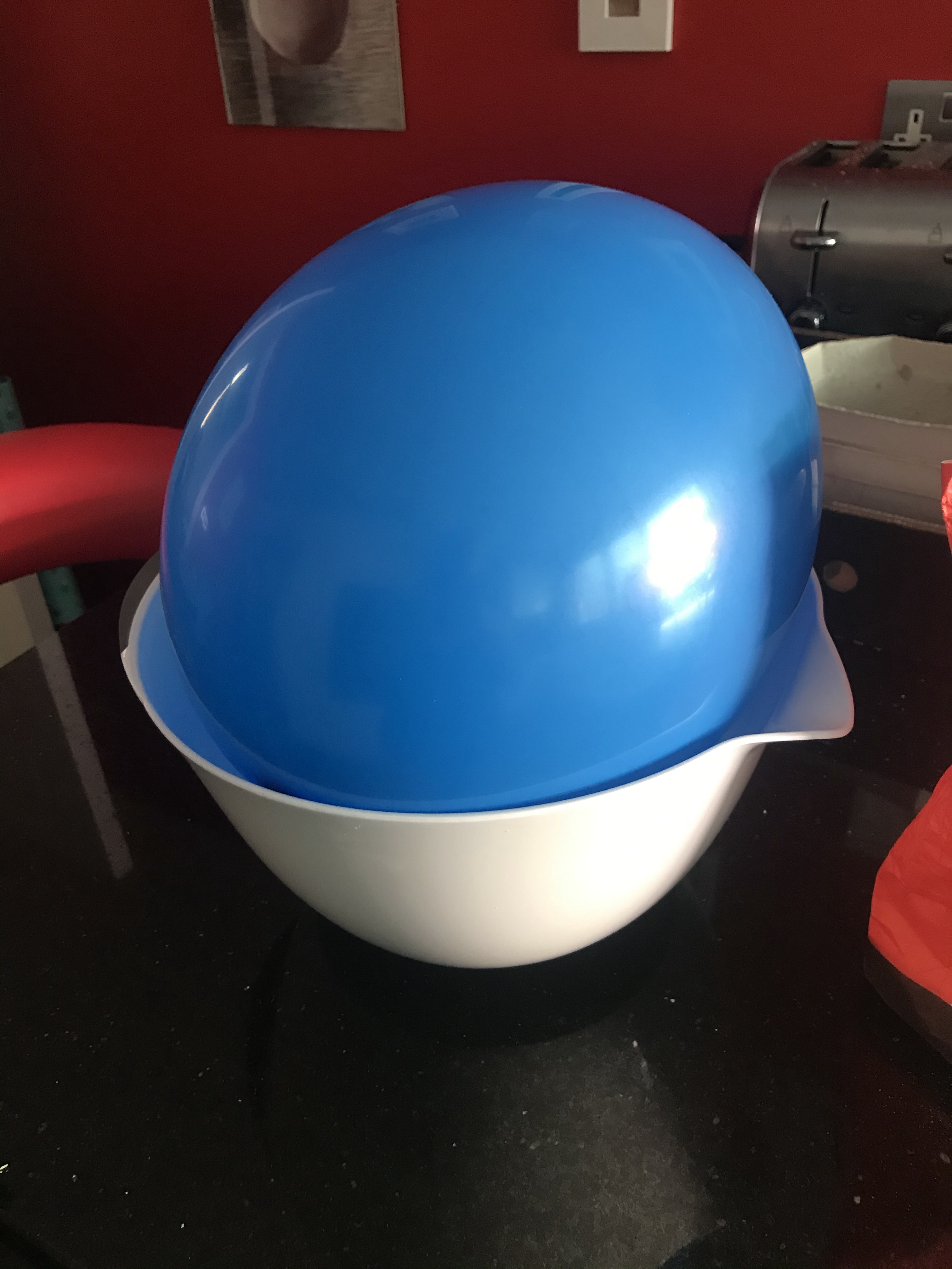 - Blow up the ballon and tie. Put in a mixing bowl to keep still.