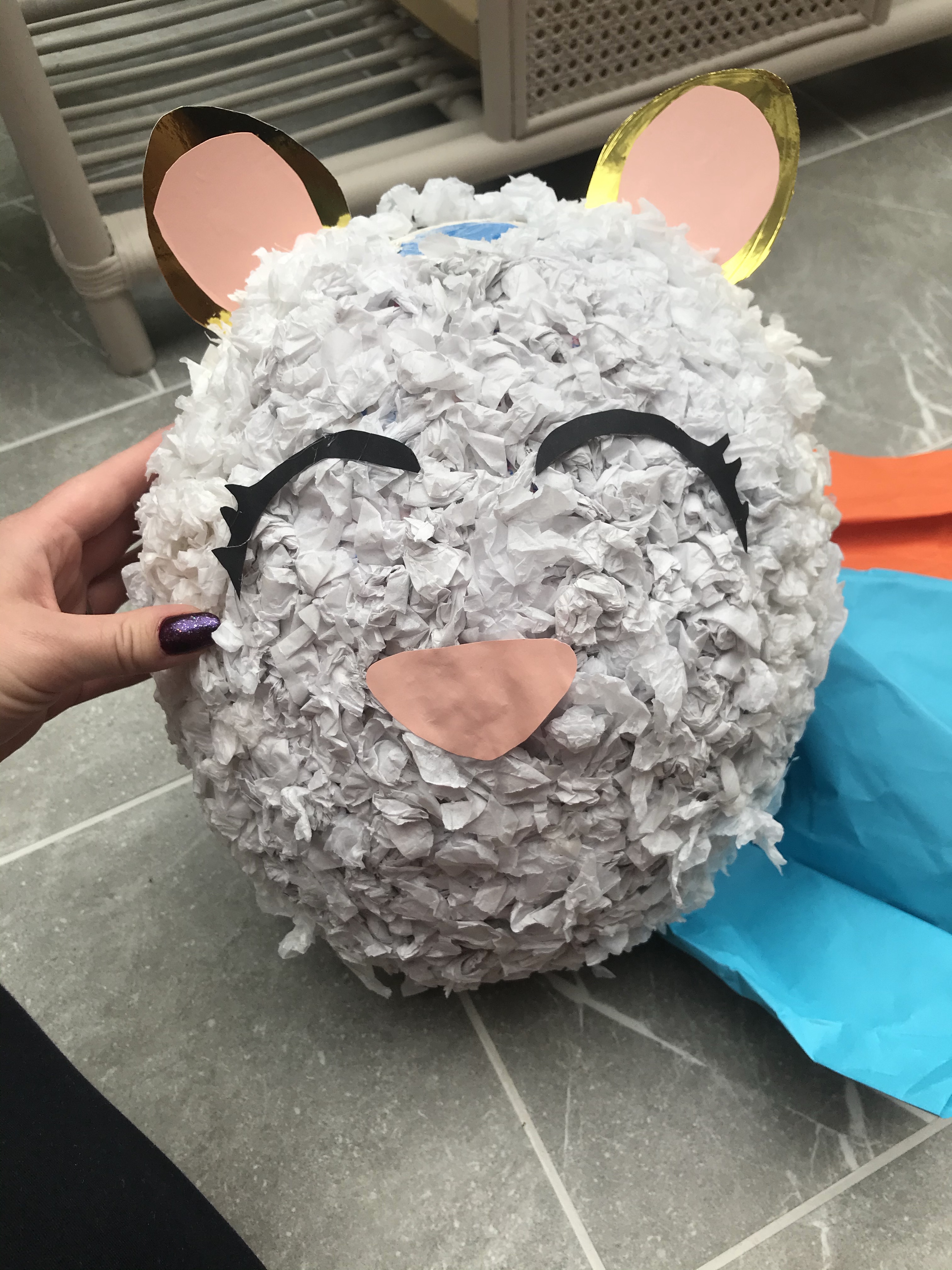 – Scrunching up tissue paper and sticking it to the piñata looks good but takes forever and requires a lot of patience from your toddler. Using streamers folded over or shredded would be a lot quicker.