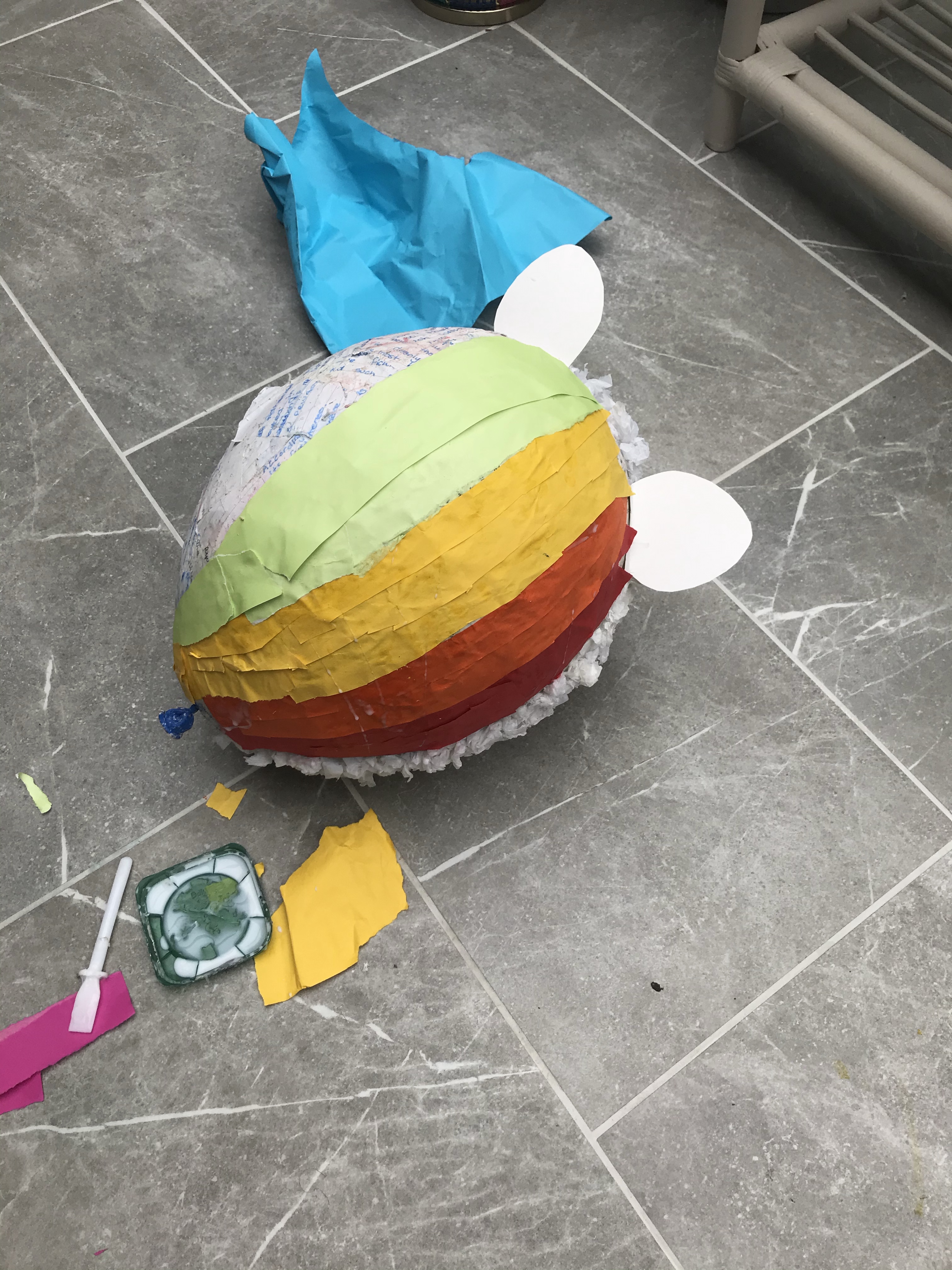 - Rip the paper into thin strips, dip both sides in the flour paste and place on the ballon. Repeat till ballon completely covered, apart from a small hole at the top to put in the sweets and attach the horn.