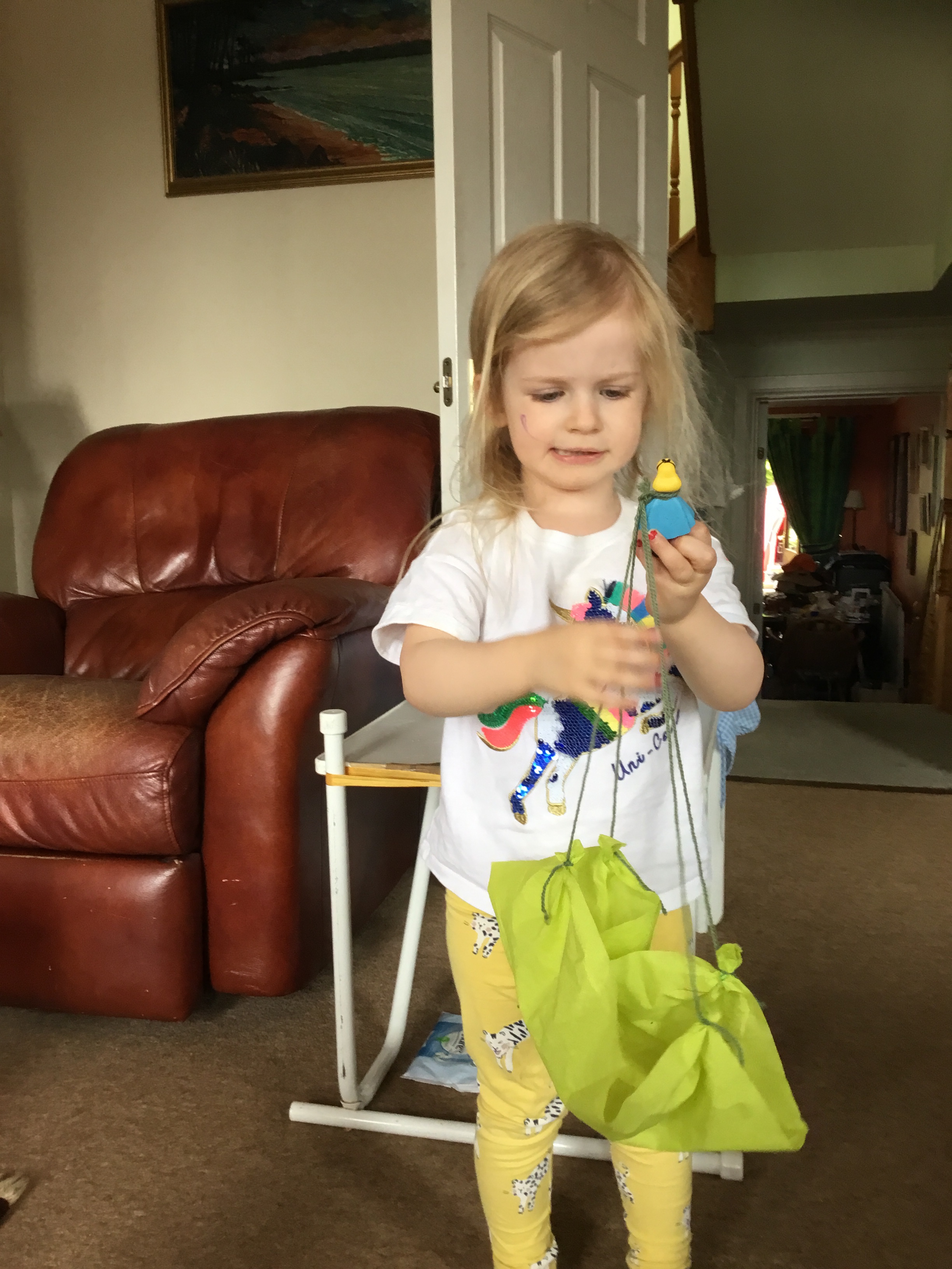 My 3 year old daughter loved this activity, to make it work however you need a high balcony, stairs or a climbing frame to drop the toys down. Obviously be careful with young children near high drops.