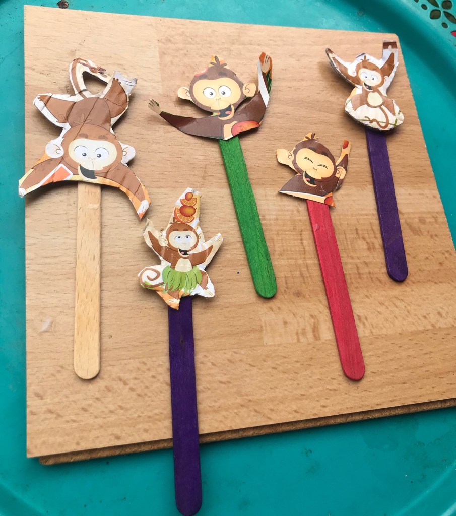 If youβre children love the happy monkey smoothies as much as mine then youβll have loads of monkeys for this craft. Alternatively monkeys are on lots of other food packing and magazines, or you could even print some from the internet. However you make them, these puppets are lots of fun to sing the well known nursery rhyme with, and can be used as normal puppets or shadow ones.