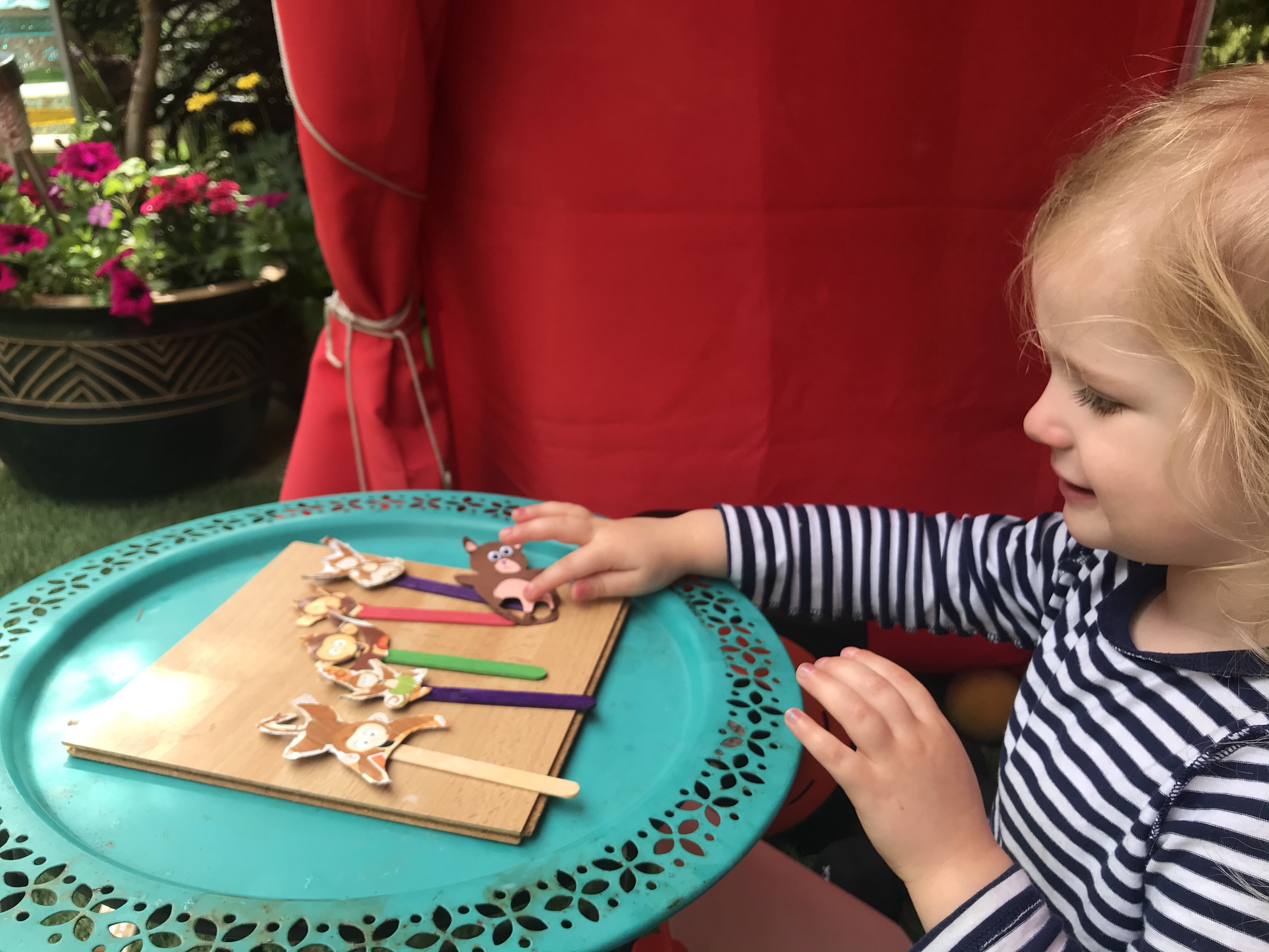 – We also made a bear puppet to be the doctor in the song. You could make a mummy monkey with a phone and a dictionary monkey too.